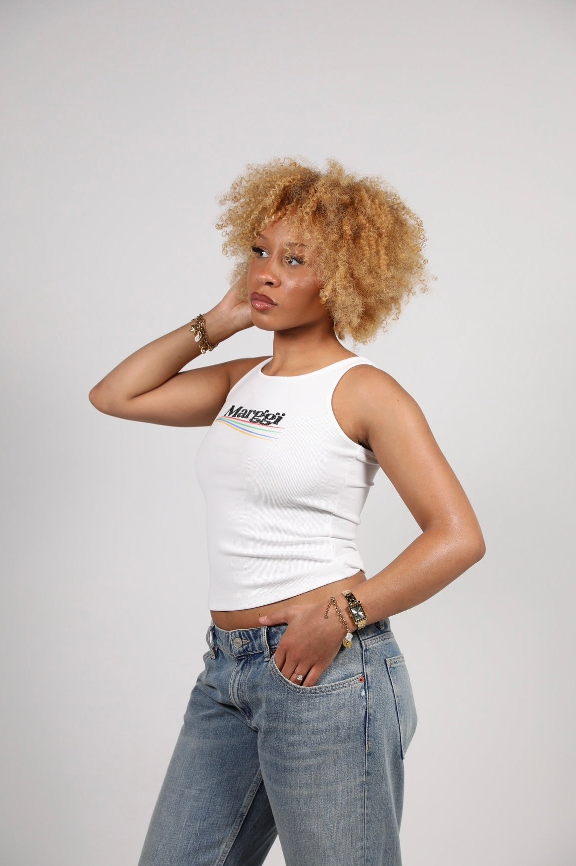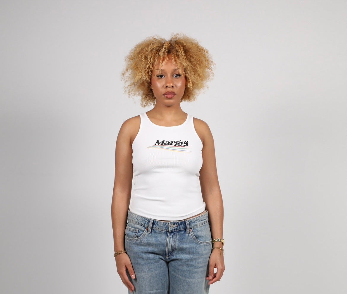 Le débardeur Color Top Marggi – une pièce forte, minimaliste et affirmée. Ce top blanc se porte aussi bien en journée décontractée qu'en soirée stylée. Porté ici par un modèle au look affirmé, il met en valeur toutes les silhouettes grâce à ses différentes tailles (du XS au XL).